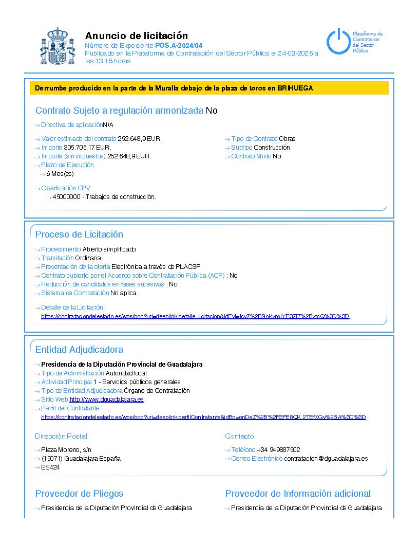La Diputación Provincial de Guadalajara ha publicado hoy, 24 de marzo, la licitación de las obras para la consolidación de un tramo de la muralla de Brihuega afectado por un derrumbe en la zona situada bajo la plaza de toros. La actuación cuenta con un presupuesto de 305.705,17 euros y un plazo de ejecución previsto de seis meses.
